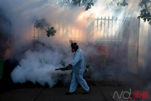 1月28日,在哥伦比亚卡利,一名卫生部工作人员喷洒灭蚊药剂。新华社/法新