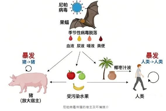 是一种人畜共患病毒,可以在动物和人之间传播,最主要感染的两种动物,就是我们日常就能见到,甚至农村地区还能时常接触到的动物:果蝠和猪。