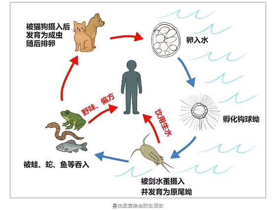 如果人们不小心饮用含有原尾蚴或裂头蚴的生水、或食用未煮熟的蛙、蛇肉,甚至用生蛙肉敷伤口,这些幼虫便可能进入人体。其中,原尾蚴会在人体内继续发育,最终变成裂头蚴。裂头蚴虽不能在人体内发育为成虫,但可长期存活(最高可达30年),并可能迁移到皮下组织、眼睛、大脑等重要部位,造成严重健康问题。