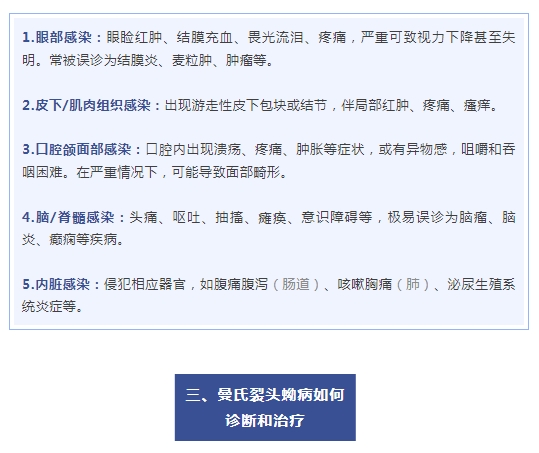 一旦出现可疑症状如不明原因的皮下包块、反复眼疾、头痛等,感到身体不适,务必到正规医疗机构就诊,科学治疗,勿信偏方。
