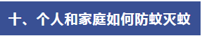 (一)个人防护。疫点周边或蚊虫活跃区域,居民应做好个人防护,出门穿着浅色长袖衣裤减少皮肤暴露,必要时使用驱蚊液、驱蚊贴等产品。室内可安装纱门纱窗,夜间睡眠时使用蚊帐。