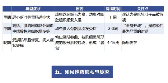 成虫期:成虫会在人体的小肠中停留几周甚至几个月来“产子”(卵胎生)。产出的幼虫“宝宝”穿透肠壁,随着血液和淋巴系统扩散到全身肌肉中,形成“囊包”。