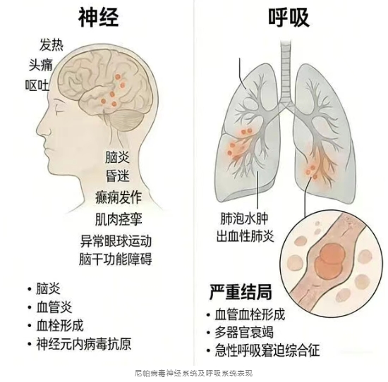 ►尼帕病毒一旦发展为重症,可累及呼吸系统及神经系统。